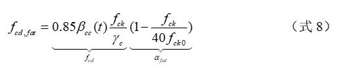 其中,γsd为荷载分项系数,一般取为1.1或1.0;σc,max为疲劳荷载引起UHPC结构中的最大压应力;ηc为计算系数,可按Mode Code 90中公式6.7-2计算;fcd,fat为UHPC的疲劳强度设计值,计算过程如式(8)所示。