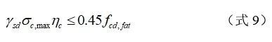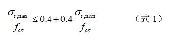 式中,σc,max为频遇荷载组合下UHPC结构中的最大压应力;σc,min为频遇荷载组合下UHPC结构中的最小压应力,当计算σc,min为拉应力时,应取σc,min=0;fck为UHPC的静力抗压强度特征值。