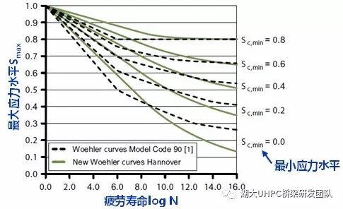 因此, Mode Code 90中对普通混凝土和高强混凝土疲劳性能的规定不能简单外延到UHPC,否则可能会在结构设计中引起偏差。因此,作者基于疲劳试验数据提出了新的计算公式。
