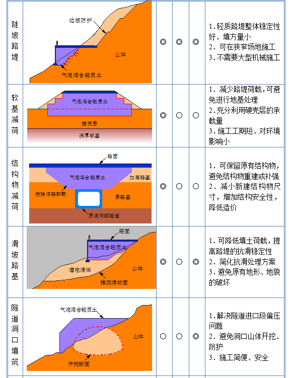 气泡混合轻质土具有质量轻、抗压强度高、整体性好、凝结自立性、保温隔热、和施工性能好等特点,可用于道路中桥台背回填、道路加宽、陡坡路基、软土路基减荷、地埋结构物减荷、桥梁减跨、隧道空洞注浆和冻土路基保温隔热等工程,能够解决桥头跳车、新旧路基沉降差异、软土路基沉降控制、陡坡路基稳定性等问题;轻质土在旧路边坡范围内采用直立路基,还可避免重新征地拆迁问题,从而简化前期工作,缩短工期。气泡混合轻质土在公路工程中的主要应用类型如表1.2所示。
