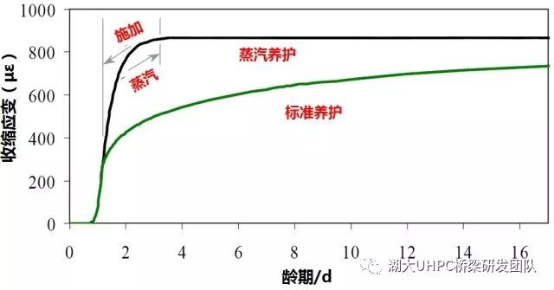 UHPC收缩应变随时间的发展方面,热养护可在48小时蒸汽养护时间内完成全部收缩,未进行热养护则在28天完成约全部收缩的60%左右。