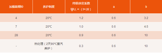终极徐变系数ψU, ∞ (t∞,t0)和拟合系数a, b按下表所示取值。